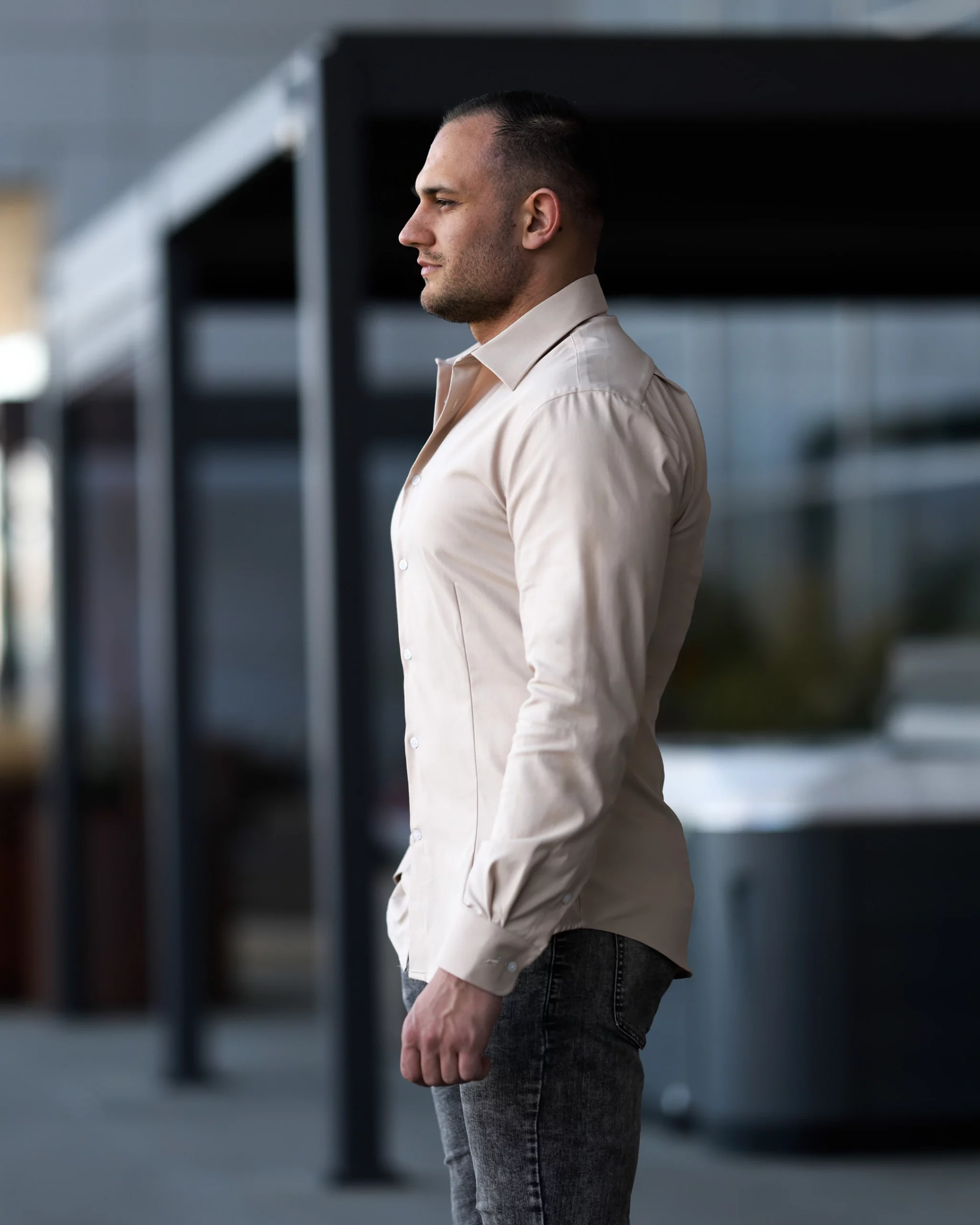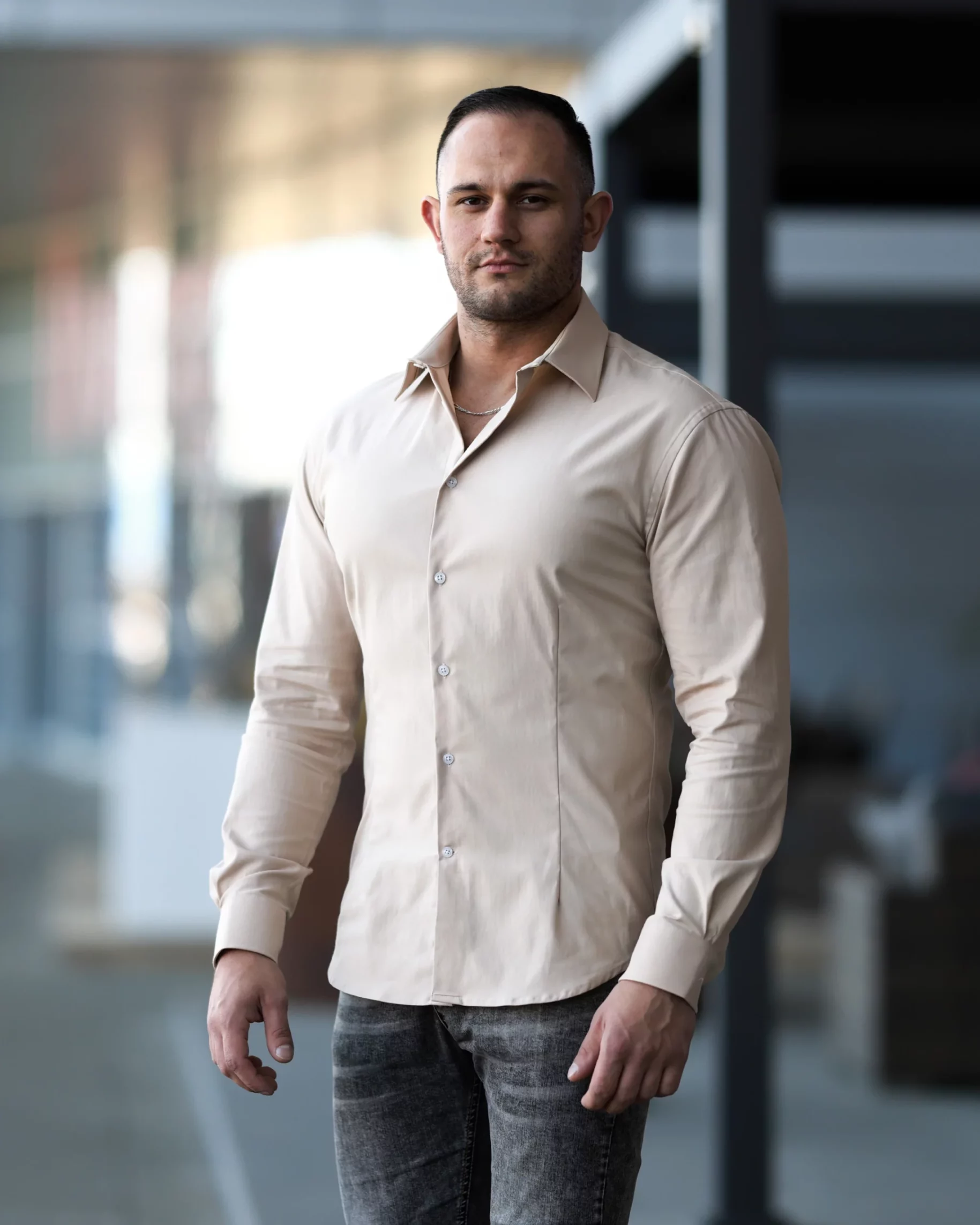 Koszula dla kulturystów w kolorze beżowym to wygodny i komfortowy model doskonale podkreślający sylwetkę. Wykonana z wysokojakościowej bawełny koszula przepuszcza powietrze, jest wygodna i przyjemna w dotyku. Dzięki domieszce elastanu i poliestrowi subtelnie przylega do ciała, podkreślając wszystkie walory muskularnej i wypracowanej sylwetki, jednocześnie nie uciskając jej i nie krępując ruchów.