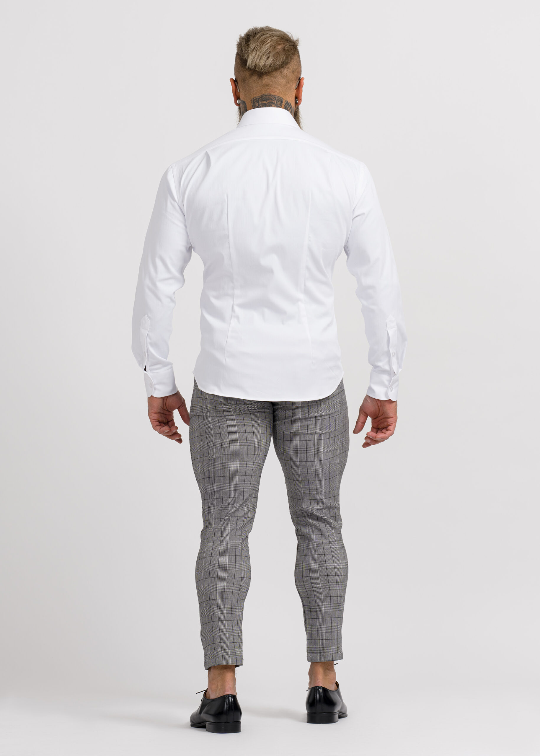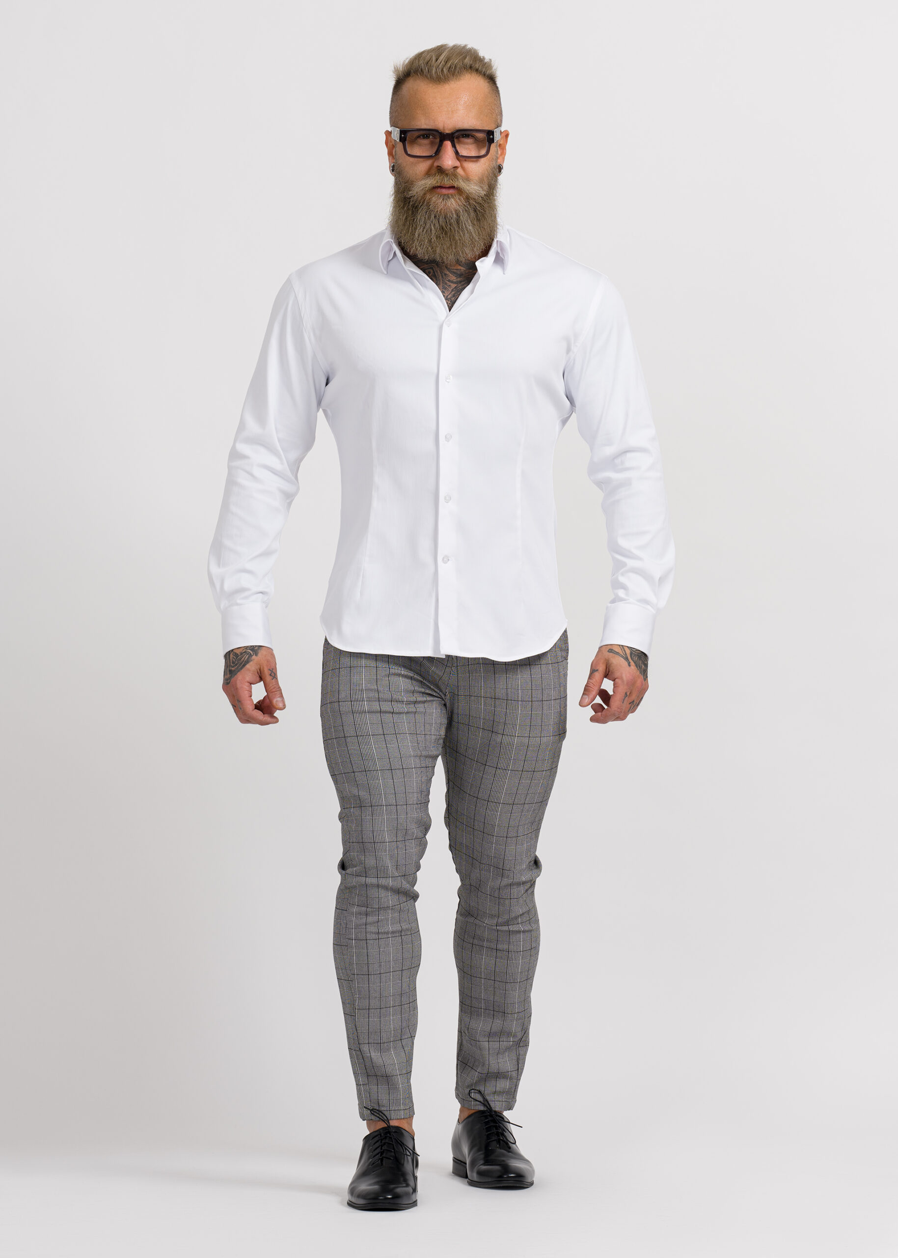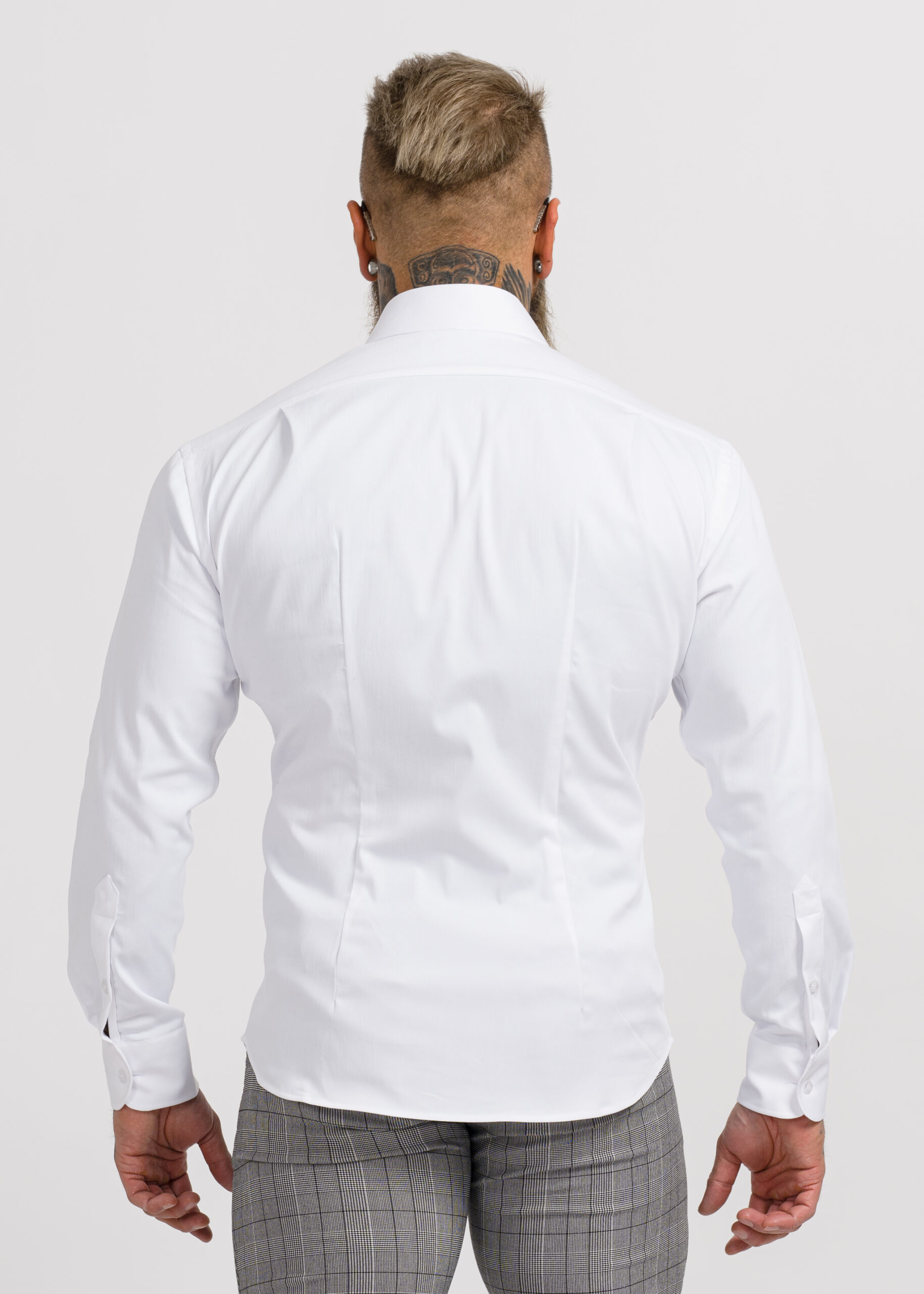 Koszula dla kulturystów w kolorze białym to wygodny i komfortowy model doskonale podkreślający sylwetkę. Wykonana z wysokojakościowej bawełny koszula przepuszcza powietrze, jest wygodna i przyjemna w dotyku. Dzięki domieszce elastanu i nylonu subtelnie przylega do ciała, podkreślając wszystkie walory muskularnej i wypracowanej sylwetki, jednocześnie nie uciskając jej i nie krępując ruchów.