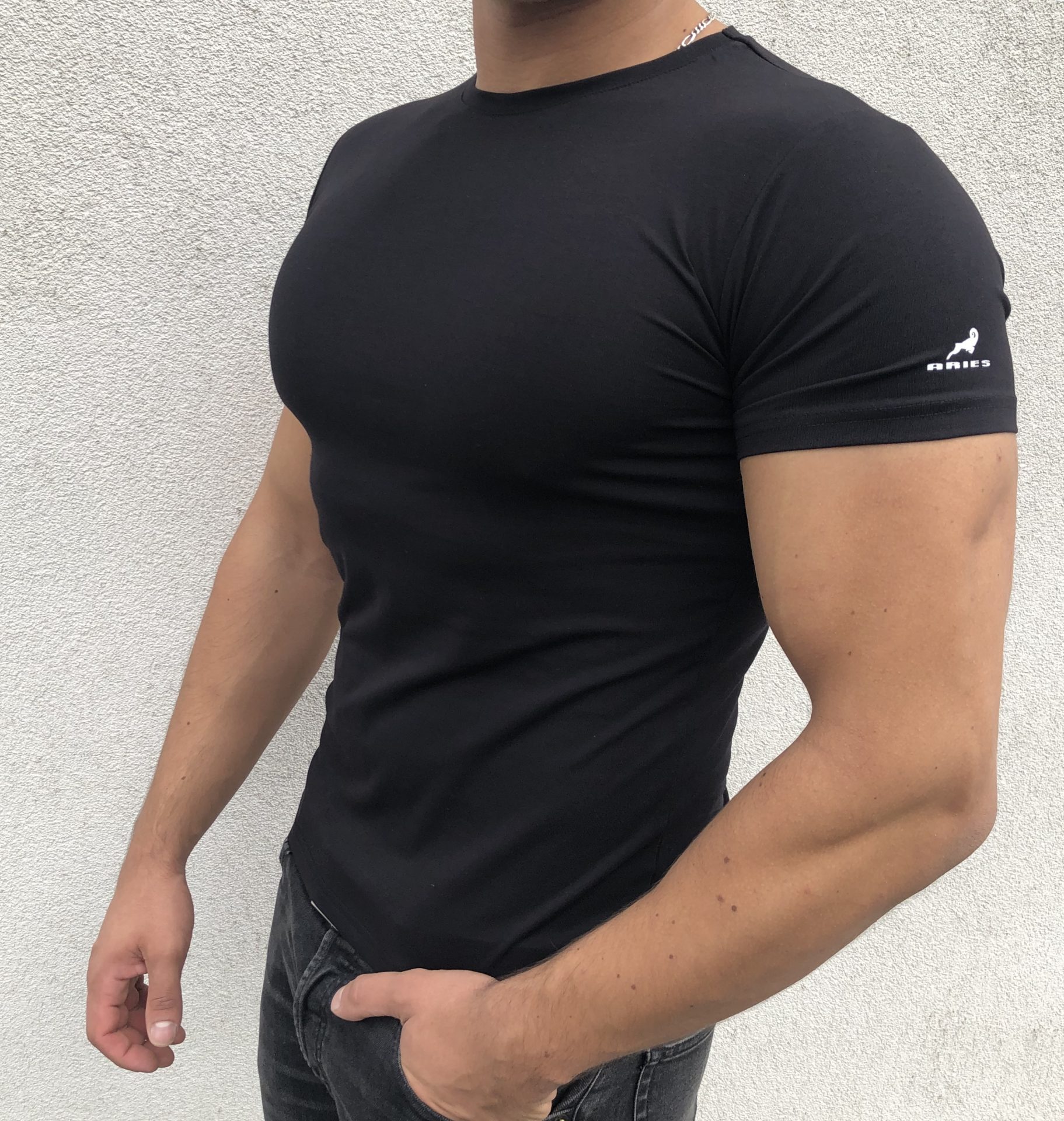 Koszulka męska Aries została wykonana z jakościowej bawełny, z domieszką elastanu. Dzięki temu koszulka nie krępuje ruchów, jest elastyczna, przepuszcza powietrze i jest przyjazna dla skóry. Model Ann White posiada subtelne zdobienie w postaci znaku logo marki Aries na lewym rękawie.
